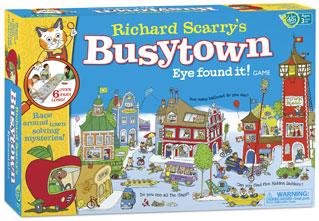 Race around town solving mysteries! How many objects can you find? Join Huckle Cat and Lowly Worm on a fun-filled race around Busytown to solve mysteries and find hidden objects. Drive through lively city streets, an activity-filled farm, an action-packed airport, and a bustling harbor full of silly boats. There's much to discover on this gigantic, colorful game board that's over six feet long! As players race through Busytown, they'll team up every time someone lands on Goldbug-leaving no corner of the board unexplored as they discover hidden objects and race toward Picnic Island. With hundreds of objects to find this game provides hours of fun, while building confidence each time a child says, "I found it!"List Price : $19.99