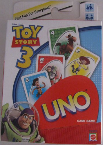 Use the Disney Pixar Toy Story Uno Card Game to play UNO to infinity and beyond with Woody, Buzz, and the toys from Andy's room. Beware of the special Lotso card and extra game rule-- you never know if he's good or bad! And be sure to yell "UNO!" when you're about to reach for the sky and win! Contains 112 cards and instructions. For Ages 7 and up. For 2 to 10 players.